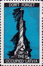 1980 г. Разм. рис. 20 х 35. Двухцветная печать на белой мелованной бумаге. Зубц. 12 1/2. С клеем(?). В центре на сплошном фоне памятник, серп и молот. Текст на английском языке текст в три строки: "Не забывайте оккупированную Латвию".