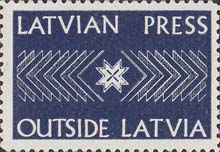 1980(?) г. Разм. 33,5 х 21,5 мм. Одноцветная печать на белой бумаге. Зубц. 12 1/2. С клеем. На сплошном фоне в центре декоративные элементы. Сверху и снизу текст на английском языке: "Латвийская пресса за пределами Латвии".