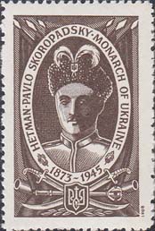 1980(?) г. Разм. 24 х 38 мм. Одноцветная печать на белой глянцевой бумаге. Зубц. 12 1/2. С клеем. В центре в прямоугольной декоративной рамке в двойной овальной рамке портрет Гетмана Скоропадского. Между рамками текст на английском языке: "Гетман Павел Скоропадский монарх Украины 1873-1945". По периметру овальной рамки флаги и оружие.