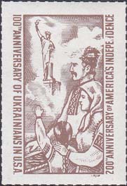 1976 г. Разм. рамки 19 х 39 мм. Одноцветная печать на белой глянцевой бумаге. Линейная просечка. В прямоугольной рамке семья украинцев. На заднем плане статуя Свободы. По наружным краям рамки вертикально тексты на английском языке.