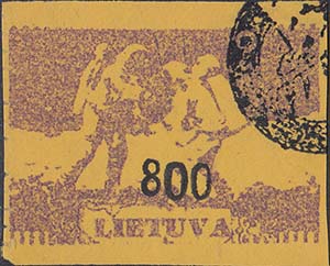1980 г. 4 Разм. рис. 47 х 33 мм. Одноцветная печать низкого качества на желтой бумаге. В центре американские космонавты на Луне. Внизу текст на английском языке: "Литва". В центре номинал в виде надпечатки.