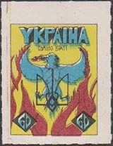 1980(?) г. Разм. рамки 21 х 27 мм. Многоцветная печать на белой бумаге. Линейная просечка. с клеем. В прямоугольной рамке в центре аллегорический рисунок: птица Феникс в языках пламени. Сверху текст: "Украина".