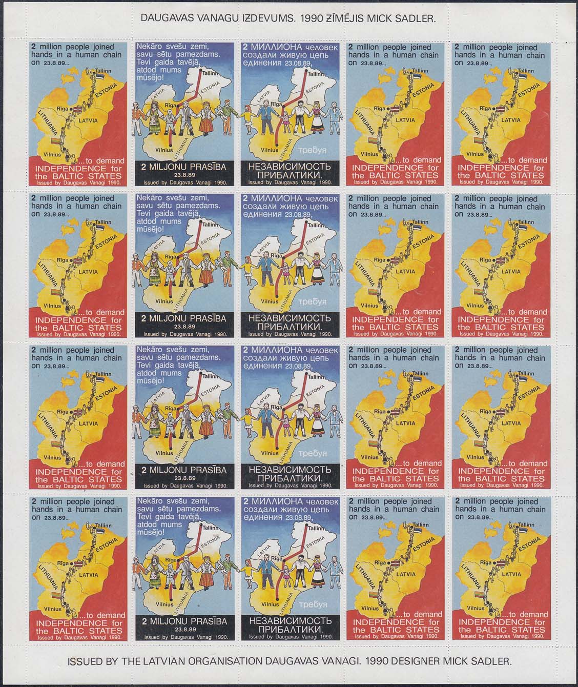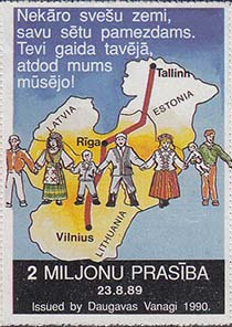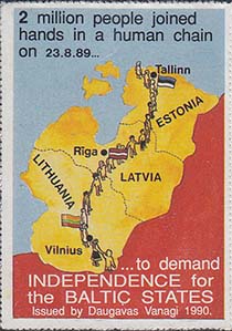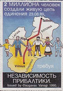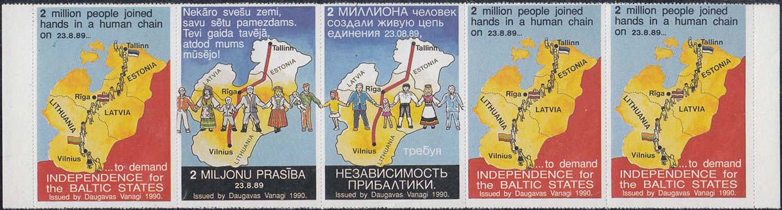 1990 г. Разм. рис. 32 х 47 мм. Многоцветная печать на белой бумаге. Мелкая зубцевидная просечка. С клеем. Карта Балтийских стран и живая цепь из людей. Тексты на английском, латышском и русском языках: "2 миллиона человек создали живую цепь единения 23.08.89 требуя независимость Прибалтики". Внизу выходные данные на английском языке: "Издание Daugavas vanagi 1990".