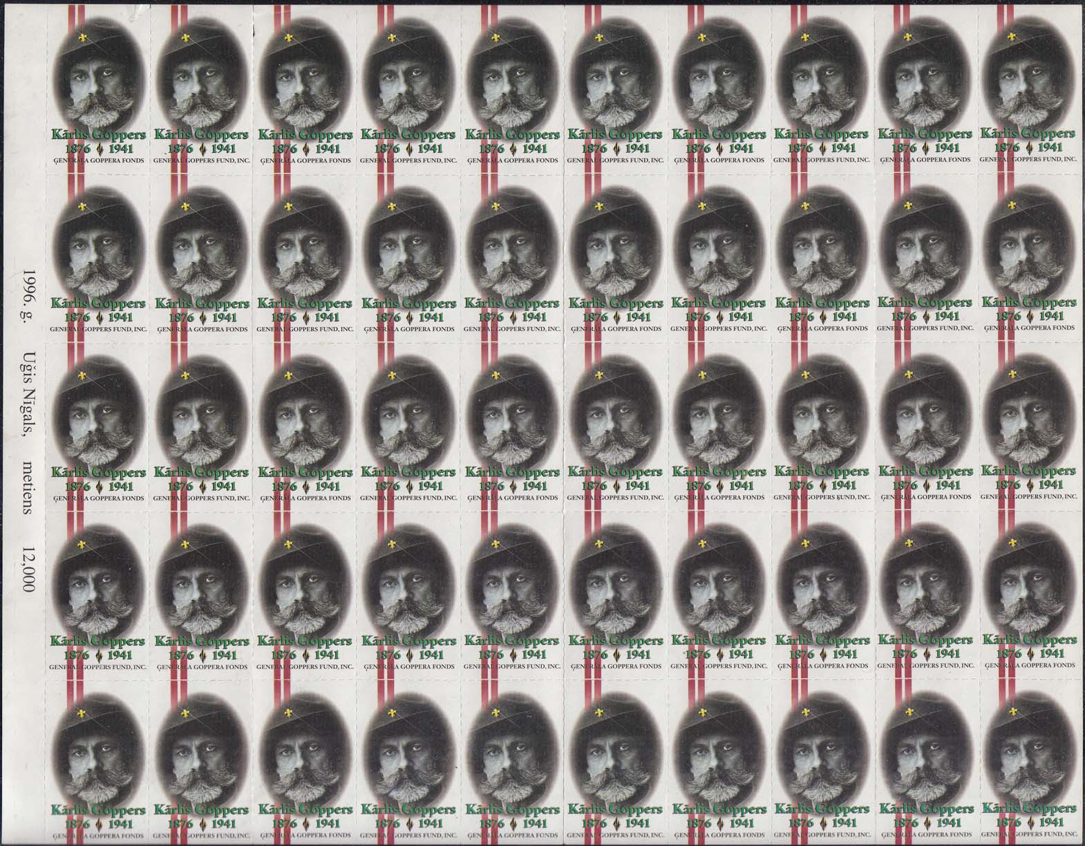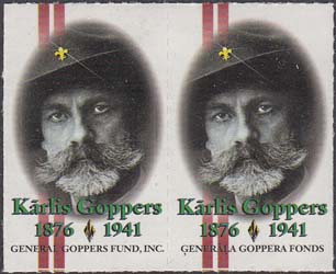 1996 г. Разм. по перфорации 25 х 41 мм. Многоцветная печать на белой мелованной бумаге. Линейная просечка. С клеем. В центре портрет генерала К. Гоппера. Под портретом текст на лвтышском языке: "Карл Гоппер 1876-1946". Внизу название организации на латышском или на английском языках.