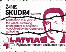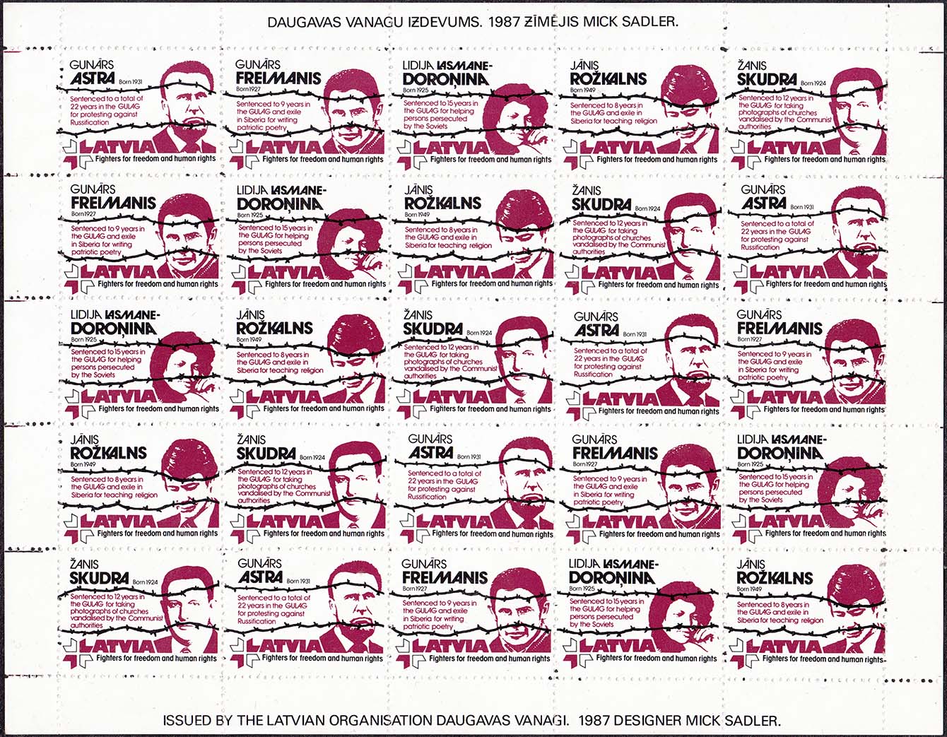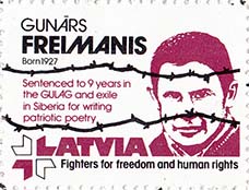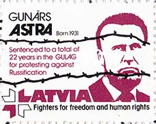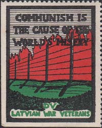 1980(?) г. Разм. рамки 30 х 38 мм. Трехцветная печать на белой бумаге. Зубц. 12 1/4. С клеем. В прямоугольной рамке забор из колючей проволоки. Сверху текст в три строки на английском языке: "Коммунизм - причина бедствий мира". Внизу текст в две строки на английском языке: "ДВ латвийские ветераны войны".