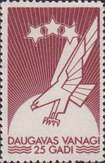 1970 г. Разм. рис. 23 х 36 мм. Одноцветная печать на белой бумаге. Зубц. 12 1/2. С клеем. В центре эмблема организации. Внизу текст в две строки на латышском языке: "Ястребам Даугавы 25 лет".