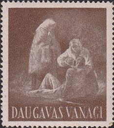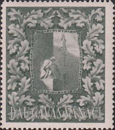 1948 г. Разм. рис. 34 х 39 мм. Одноцветная печать на белой бумаге. Зубц. 11 1/2. С клеем. В центре различные рисунки. Внизу текст на латышском языке: "Ястребы даугавы".