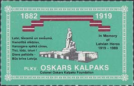 1989 г. Разм. рамки 4 х 25 мм. Двуцхцветная печать на белой глянцевой бумаге. Линейная просечка. С клеем. На сплошном фоне в прямоугольной декоративной рамке в центре памятник. Тексты на латышском и английском языках. Внизу название организации.