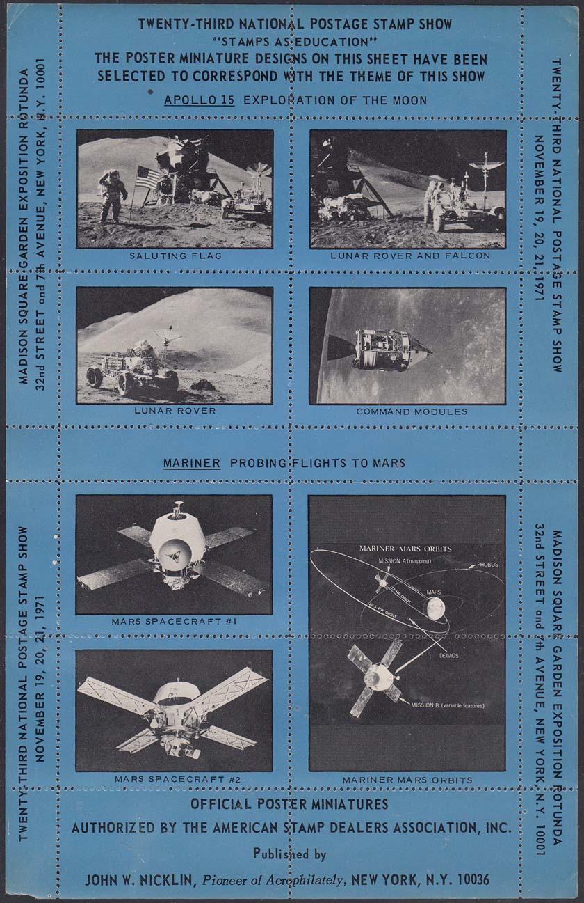 1971 г. Разм. по перфорации 52 х 36 мм. Двухцветная печать на белой бумаге. Зубц. 12 1/2. С клеем. В центре различные рисунки, посвященные американским программам Аполлон и Маринер.