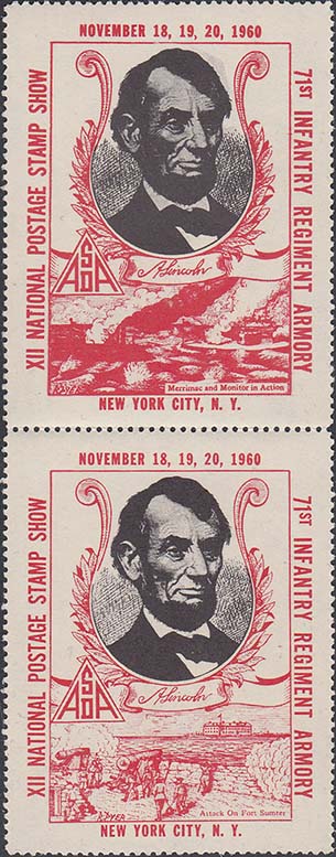 1960 г. Разм. рамки 37 х 53 мм. Двухцветная печать на белой бумаге. Зубц. 12 1/2. С клеем. В центре в декоративной рамке портрет А. Линкольна. Внизу различные батальные сцены. Тексты на английском языке.