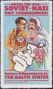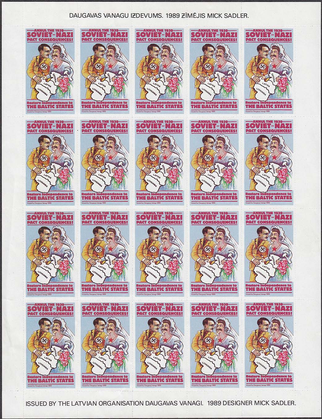 1989 г. Разм. рис. 27 х 47 мм. Многоцветная печать на белой мелованной бумаге. Нерегулярная мелкая просечка. С клеем. В центре на сплошном фоне аллегорический рисунок: Сталин и Гитлер в виде свадебной пары. Сверху текст в четыре строки на английском языке: «Ликвидировать последствия советско-нацистского пакта 1939». Внизу текст в две строки на английском языке: «Восстановить независимость Балтийских стран». Внизу мелким шрифтом выходные данные на английском языке: «Издание daudavas vanagi».