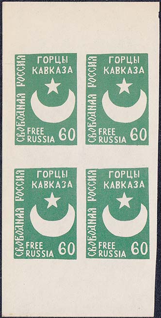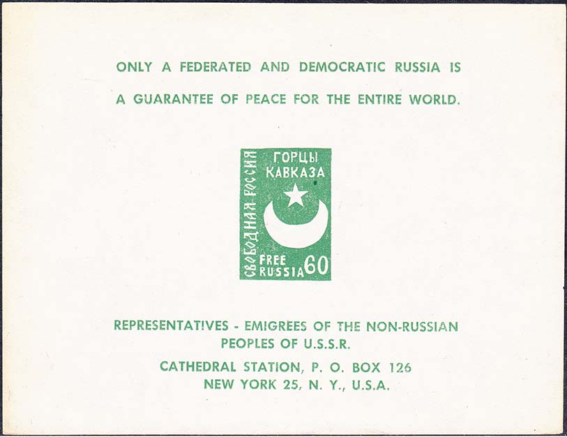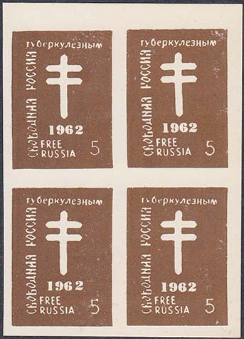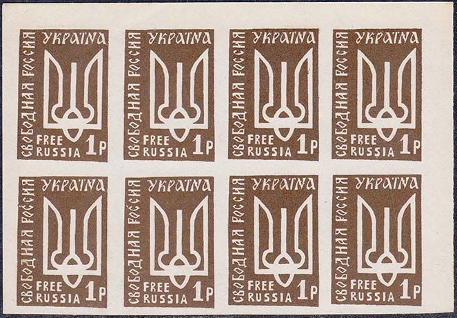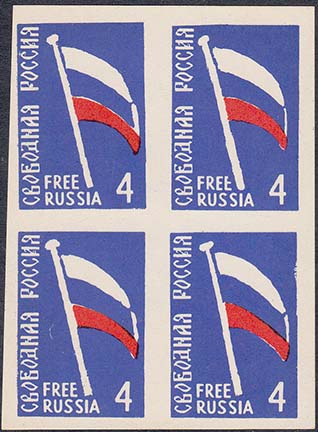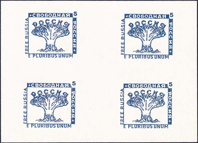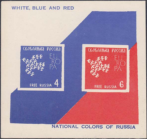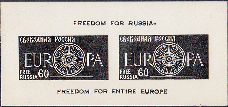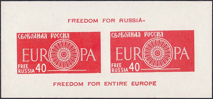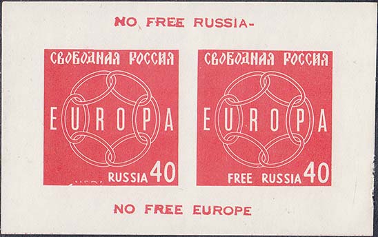 1959(?) г. 15.10.1959 г. Блоки разм. 92 х 57 мм. Одноцветная печать на простой белой бумаге. В центре по две марки с символикой объединенной Европы, номиналом и текстом: "Свободная Россия" на русском и английском языах. На полях текст на английском языке.