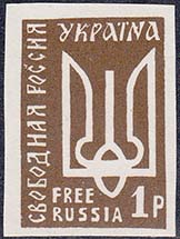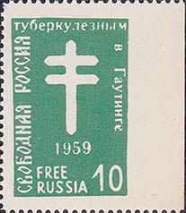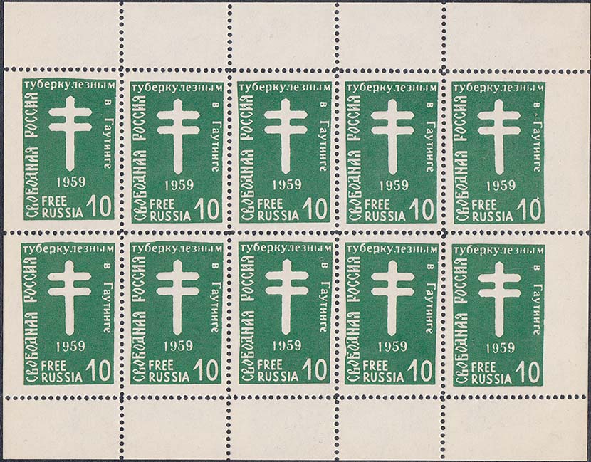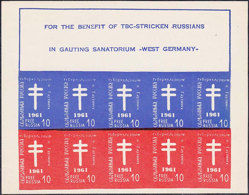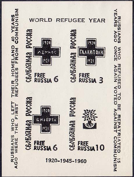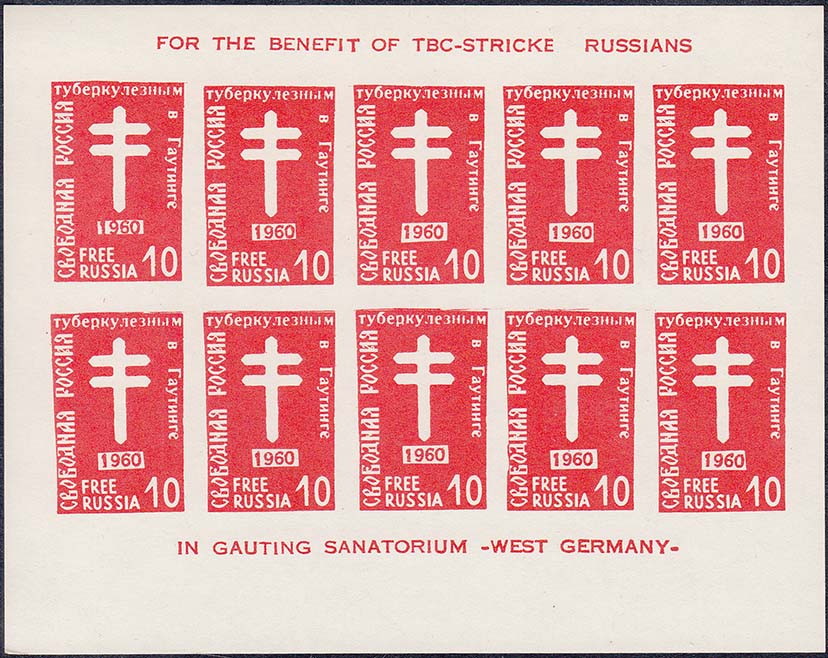 1960 г. 10.10.1960 г. Листок разм. 139 х 110 мм. Одноцветная печать на простой белой бумаге и на белой бумаге с ВЗ. 10 марок разм. рис. 22 х 34 мм с лотарингским крестом в центре и датой: "1960". По периметру номинал и тексты на русском и английском языке. На полях малого листа тексты на английском языке.