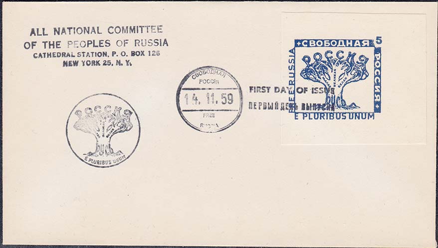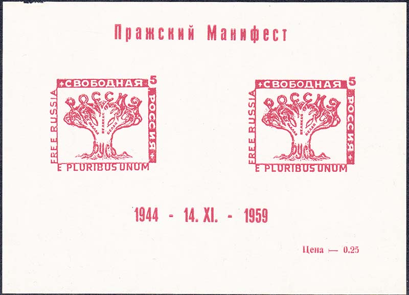 1959 г. 14.11.1959 г. Блок разм. 133 х 97 мм. Одноцветная печать на белой бумаге. С клеем. В центре две марки с аллегорическим изображениям России в виде дерева, номиналом и текстами на русском и английском языках. На полях блока текст в две строки: "Пражский Манифест 1944 - 14.XI. - 1959".