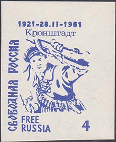 1961 г. 28.02.1961 г. Разм. рис. 28 х 37 мм. Одноцветная печать на белой бумаге. с клеем. В центре матрос с винтовкой. По периметру номинал и тексты на русском и английском языках.