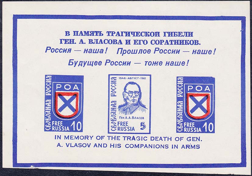 1961 г. 02.08.1961 г. Блок разм. 129 х 85 мм. Двухцветная печать на белой бумаге. С клеем. В центре три марки с портретом генерала Власова и эмблемой РОА. тексты на русском и английском языках.