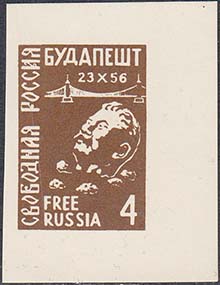 1961 г. 23.10.1961 г. Разм. рис. 22 х 31 мм. Одноцветная печать на белой бумаге. С клеем. В центре на сплошном фоне барельеф Сталина и мост в Будапеште.