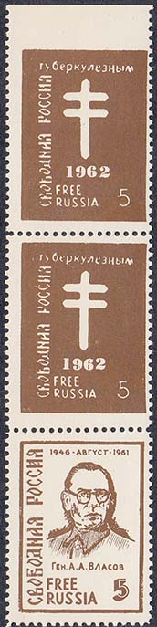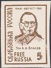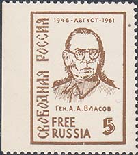 1962 г. 17.01.1962 г. Разм. рамки 24 х 33 мм. Одноцветная печать на белой бумаге. Зубц. 11 3/4 и БЗ. В прямоугольной рамке в центре портрет генерала Власова, номинал и тексты на русском и английском языках.