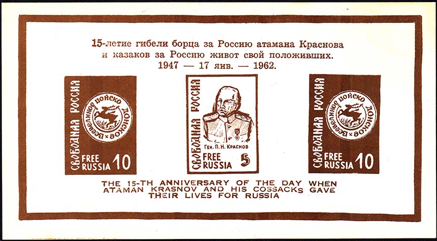 1962 г. 17.01.1962 г. Блок разм. 145 х 79 мм. Одноцветная печать на белой бумаге. С клеем. В центре в прямоугольной рамке разм. 135 х 68 мм марки с эмблемой Войска Донского и портретом генерала Краснова, номиналами и текстами на русском и английском языках. На полях блока текст на русском и английском языках.