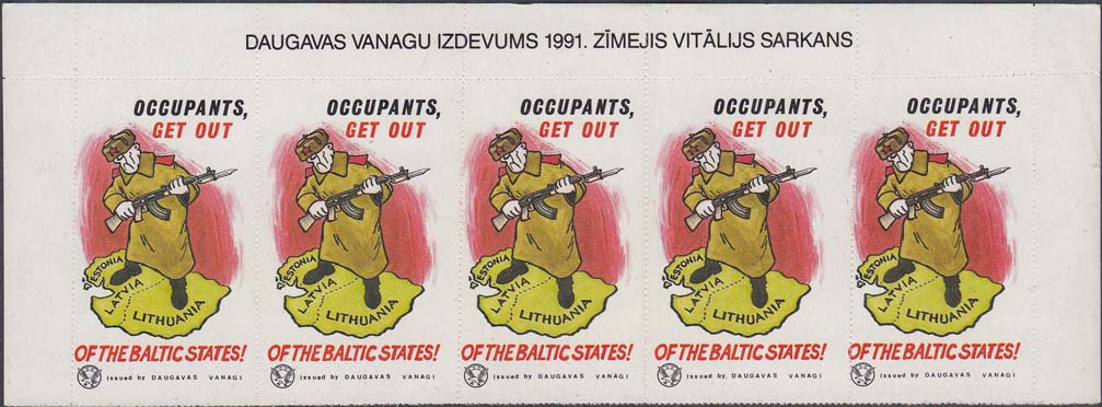 1991 г. Разм. по перфорации 30 х 50 мм. Многоцветная печать на белой мелованной бумаге. Нерегулярная мелкая просечка. С клеем. В центре на сплошном фоне аллегорический рисунок: советский солдат с автоматом стоит на карте стран Балтии. Текст на английском языке в три строки: "Оккупанты, прочь из Балтийских стран!". Внизу эмблема организации и мелким шрифтом выходные данные на английском языке: «Издание daudavas vanagi».