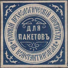 1912(?) г. Разм. рамки 38 х 38 мм. Одноцветная печать на белой бумаге. С клеем(?). В прямоугольной декоративной рамке вписана круглая рамка из концентрических окружностей. В круглой рамке в центре на сплошном фоне текст в две строки: "Для пакетов" и декоративные элементы. По периметру между круглыми рамками текст: "Русский археологический институт в Константинополе".