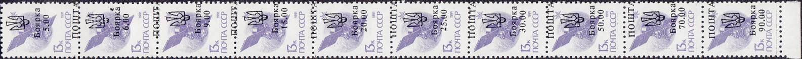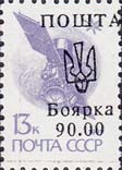 1992 г. Надпечатка трезубца, номинала и текста на украинском языке: "Почта Боярка" на стандартной марке СССР №3601А 1991 г.