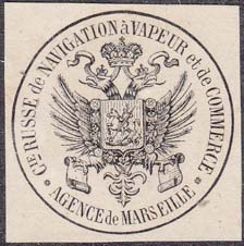 1910(?) г. Разм. 37 х 37 мм. Одноцветная печать на белой бумаге. С клеем(?). В круглой рамке диаметром 35 мм герб Агентства. По внутреннему периметру рамки текст на французском языке. Русское агентство пароходной коммерческой навигации в Марселе.