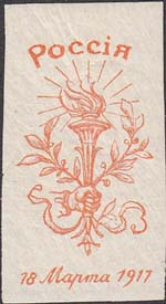 1917 г. Разм. 24 х 44 мм. Одноцветная печать на белой (оттенки) бумаге. С клеем. В центре рука, держащая факел с лавровыми ветвями и лентами. Сверху текст: «Россия». Внизу текст: «18 марта 1917».