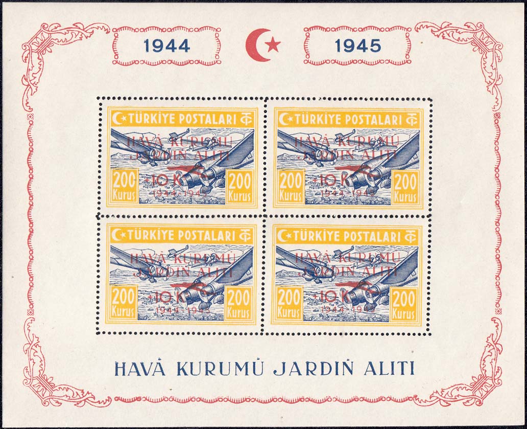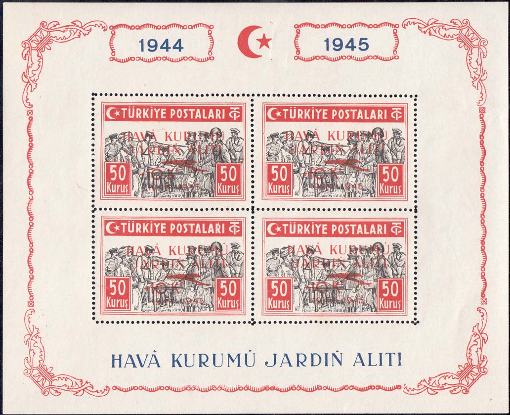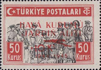 1945 г. Красная надпечатка текста на турецком языке, номинала надбавки, контура самолета и дат: "1944 - 1945" на марках предыдущего выпуска.