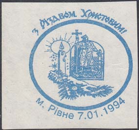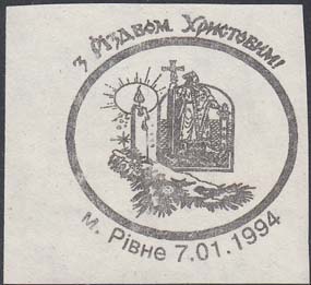 1994 г. 07.01.1994 Разм. 41 х 44 мм. Одноцветная печать на простой белой бумаге. В овальной рамке разм. 36 х 31 мм рождественский сюжет. По наружному периметру рамки текст на украинском языке: "С Рождеством Христовым! г. Ровно 7.01.1994".