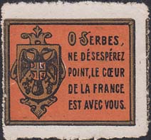 1914(?) г. Разм. рамки 31 х 25 мм. Двухцветная печать на белой бумаге. нерегулярная зубц. С клеем(?). В двойной прямоугольной рамке на сплошном фоне слева стилизованный герб Сербии. Справа текст в пять строк на французском языке.