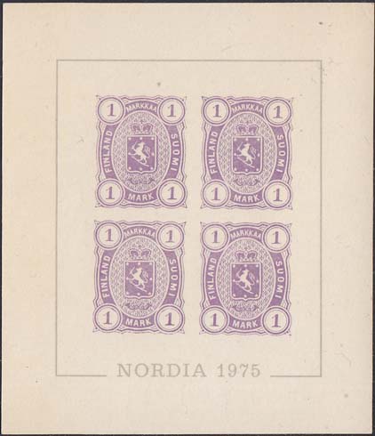 1975 г. Разм. 71 х 82 мм. Двухцветная двухсторонняя печать на плотной белой бумаге. На лицевой стороне в прямоугольной рамке разм. 51 х 61 мм изображение квартблока почтовой марки ВКФ выпуска 1875 года с ошибкой в номинале. На обороте пояснительный текст на финском, шведском и английском языках.