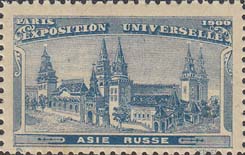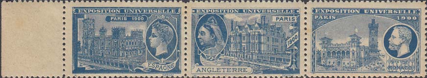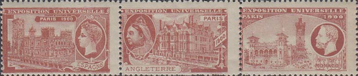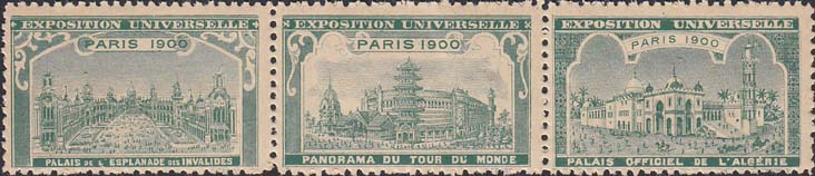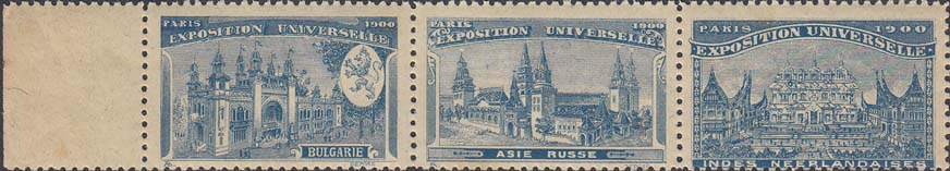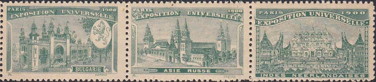 1900 г. Рахм. рис. 37,5 х 22 мм. Одноцветная печать на белой бумаге. Зубц. 11. С клеем. В центре павильоны различных стран - участниц выставки. Текст: "Париж 1900 Всемирная выставка".