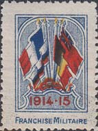 1915 г. Разм. рамки 18 х 24 мм. Многоцветная печать на белой бумаге. Зубц. 11. С клеем. В прямоугольной декоративной рамке в центре флаги стран России, Франции, Бельгии и Англии. В основании флагов даты: "1914-15". Внизу текст на французском языке: "Военная франшиза".