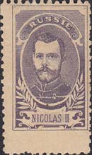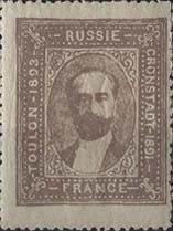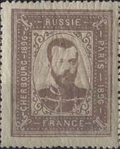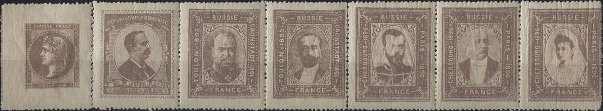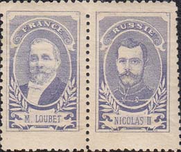 1910(?) г. Разм. рамки 18 х 29,5 мм. Зубц. 11 1/4. С клеем. В центре в прямоугольной рамке портреты политических деятелей России и Франции. Сверху полукругом текст на французском языке: "Россия". Внизу подпись к портрету на французском языке.
