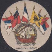1914(?) г. Круг диаметром 28,5 мм. Многоцветная печать на белой бумаге. С клеем. В центре изображение корабля и флаги стран-союзниц России в первой мировой войне. Внизу текст на французском языке: "До конца".