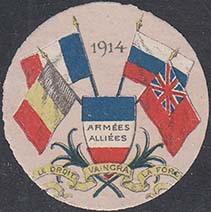 1914 г. Круг диаметром 35 мм. Многоцветная печать на белой бумаге. С клеем. В центре на фоне флагов Бельгии, Франции, России и Англии щиток цветов французского флага. На щитке текст в две строки на французском языке: "Союзные армии". Сверху дата: "1914".