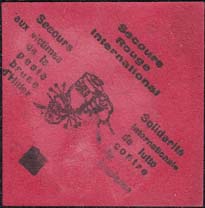 1939(?) г. Ромб разм. 48 х 48 мм. Одноцветная печать на плотной розовой бумаге. На лицевой стороне в центре рабочий замахивается на штурмовика. Текст на французском языке: "Долой фашизм. Rot front". На оборотной стороне карикатура на А. Гитлера и различные лозунги на французском языке.