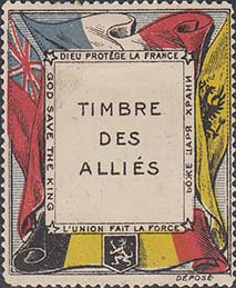 1914(?) г. Разм. рамки 34 х 41 мм. Многоцветная печать на белой бумаге. Зубц. 13 1/4. С клеем. В центре в декоративной рамке из флагов стран Альянса текст в три строки на французском языке.