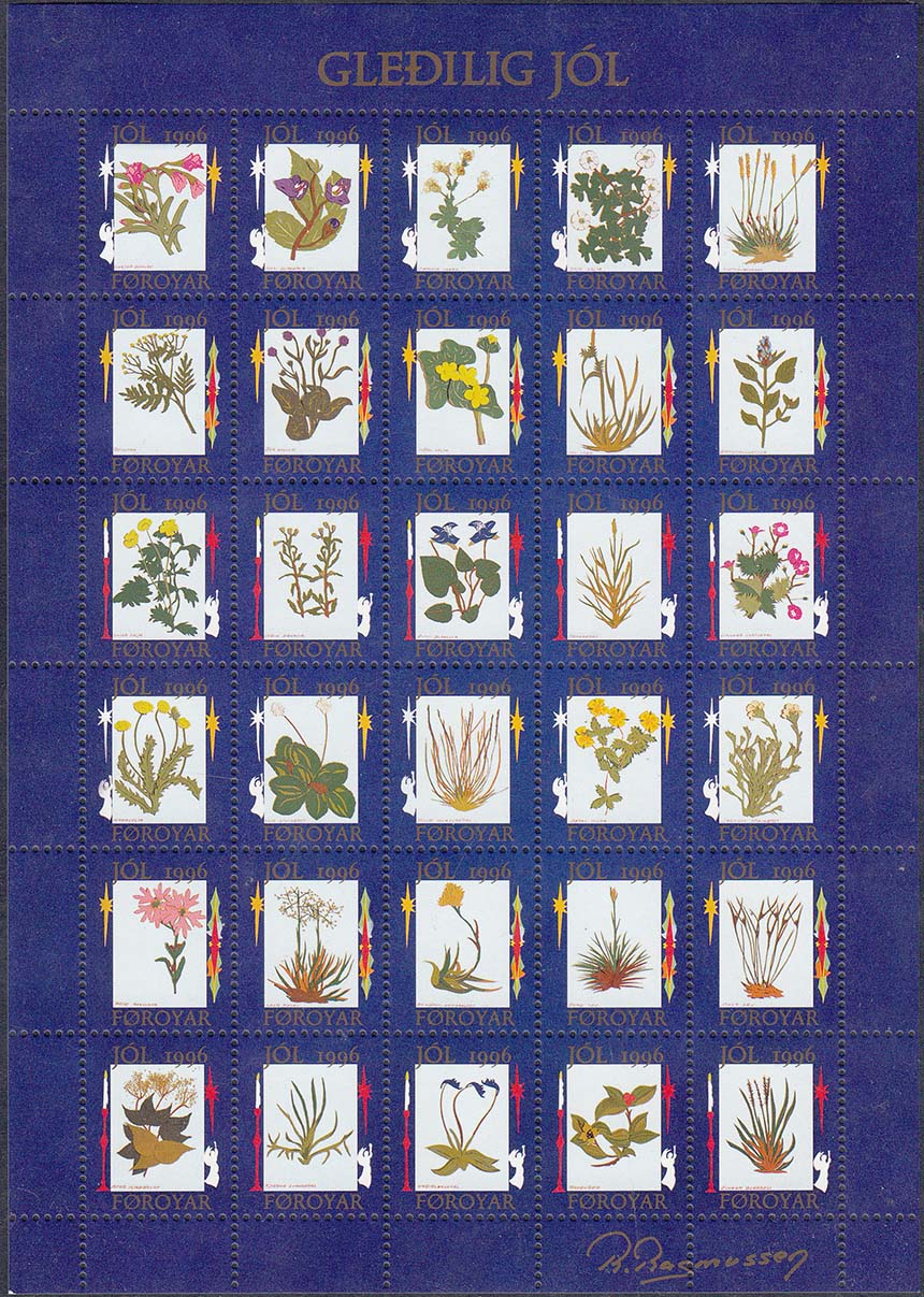 1996 г. Разм. по перфорации 24 х 29 мм. Зубц. 10 3/4. С клеем. В центре изображения различных растений. Тексты на датском языке.