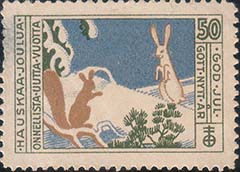 1926 г. Разм. рамки 34,5 х 22,5 мм. Трехцветная печать на белой бумаге. Зубц. 11 1/2. С клеем. Белка и заяц в зимнем лесу. Слева и справа вертикально тексты на финском и других скандинавских языках: «Счастливого Рождества». В правом верхнем углу номинал.