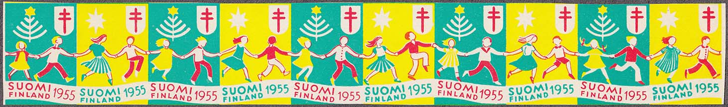 1955 г. Разм. рис. 25 х 35 мм. Трехцветная печать на белой бумаге. С клеем. на сплошном фоне в центре двое детей держатся за руки. В Левом верхнем углу Стилизованное изображение наряженной елки или солнце. В правом верхнем углу Лотарингский крест. Внизу на ленте дата: "1955" и название страны на финском и английском языках.