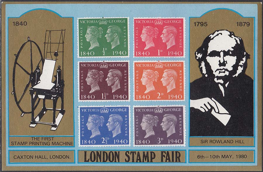 1980 г. Листок разм. 151 х 99 мм. В цен ре серия марок 1940 г. Слева печатный станок. Справа портрет Р. Хилла. Тексты на английском языке.