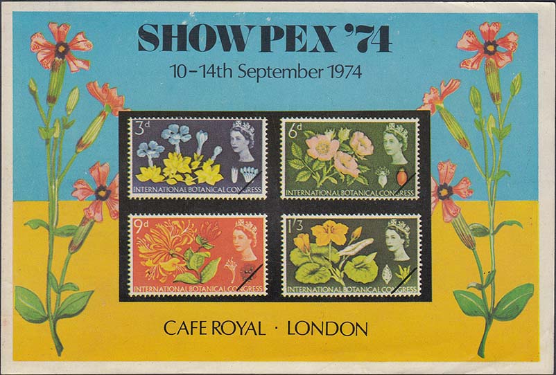 1974 г. Листок разм. 161 х 129 мм. Многоцветная печать на белой глянцевой бумаге. В центре четыре марки с изображениями цветов. На полях листка цветы. Тексы на английском языке.