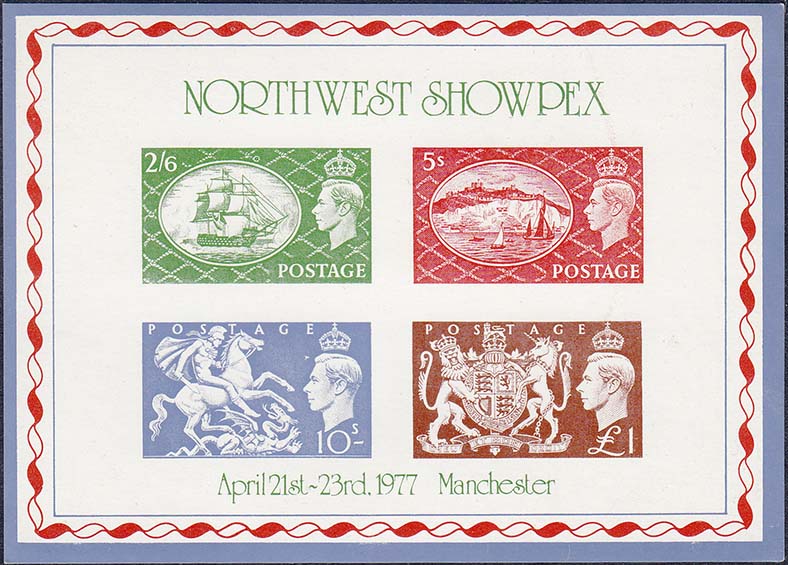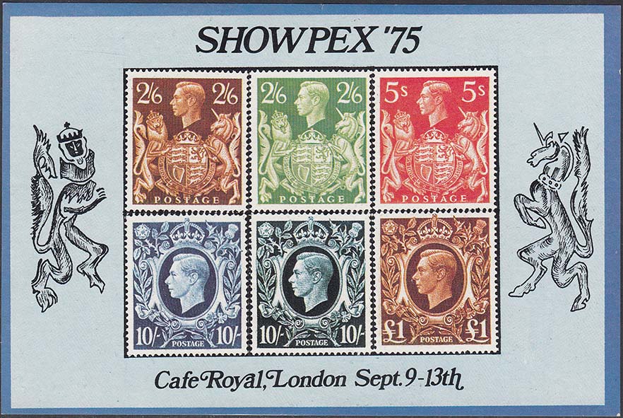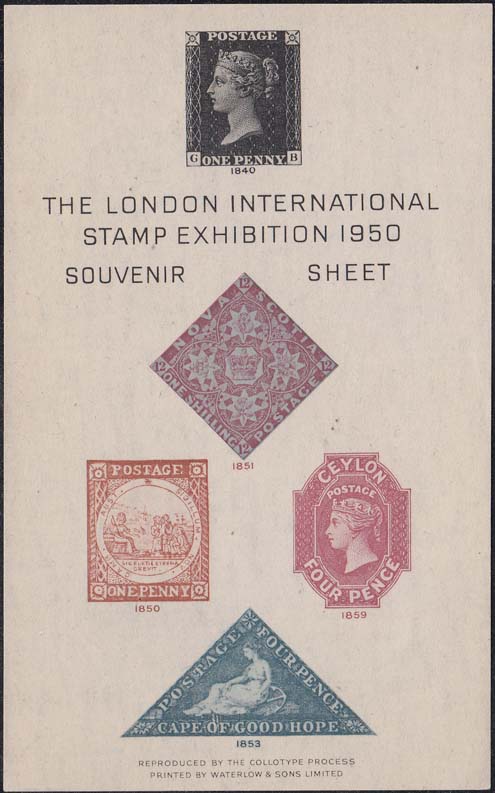 1950 г. Листок разм. 83 х 134 мм. Многоцветная печать на простой белой бумаге. В центре репродукции различные почтовых марок Великобритании. Сверху текст на английском языке в три строки: "Международная филателистическая выставка в Лондон 1950. Сувенирный листок". Внизу мелким шрифтом выходные данные на английском языке.