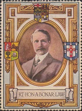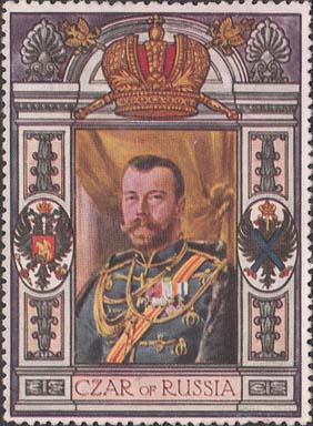 1915 г. Разм. рамки 44 х 63 мм. Многоцветная печать на белой бумаге. В прямоугольной декоративной рамке в центре портреты государственных деятелей. Внизу подпись к портрету на английском языке.
