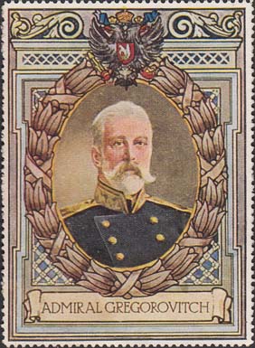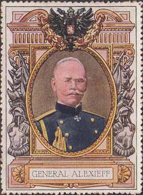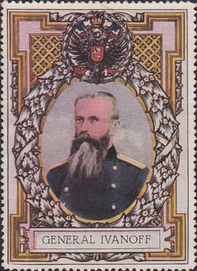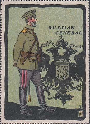 1912 г. 4 Разм. рис. 45 х 63 мм. Многоцветная печать на белой бумаге. В декоративной рамке на сплошном фоне генерал в форме и стилизованный герб России. В правом верхнем углу текст в две строки на английском языке: "Русский генерал".