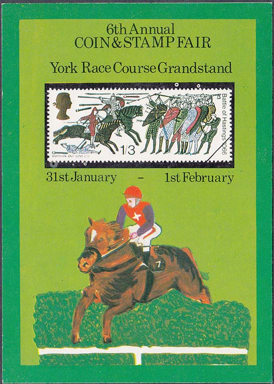 1980(?) г. Листок разм. 91 х 128 мм. Многоцветная печать на толстой белой глянцевой бумаге. В центре наездник на лошади, прыгающий через барьер. Сверху почтовая марка Великобритании, посвященная битве при Гастингсе и тексты на английском языке.
