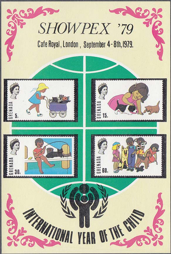 1979 г. Листок разм. 98 х 145 мм. Многоцветная печать на белой глянцевой бумаге. В центре четыре почтовх марки Великобритании. Сверху и снизу тексты на английском языке.
