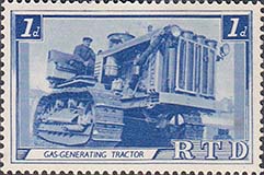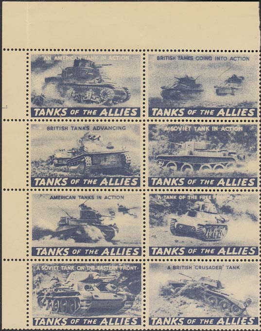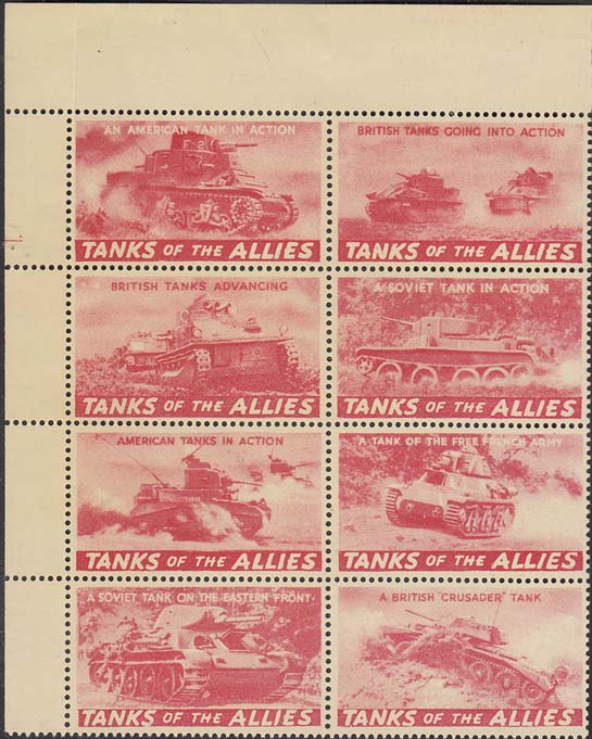 1942(?) г. Разм. рисунка 38,5 х 22 мм. Одноцветная печать на белой бумаге. Зубц. 14 1/2. С клеем. В центре изображения танков стран антигитлеровской коалиции во второй мировой войне. Сверху подпись к рисунку на английском языке. Внизу на сплошном фоне текст на английском языке: "Танки союзников".